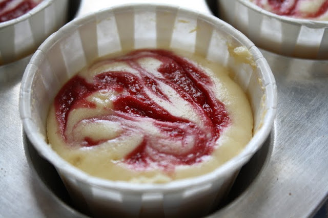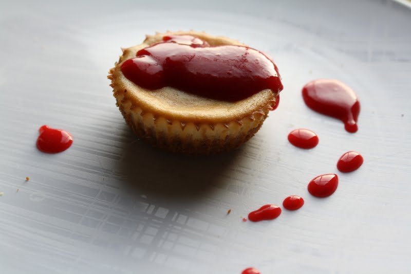 Into your mixer add the cream cheese, mix until smooth.  Slowly add the sugar and then the eggs one at a time. Add the vanilla and the melted chocolate.  Beat until no lumps are seen.  Ladle the cream cheese mixture into the cups.  Drop a few dots of raspberry puree on the tops of the cheesecakes.