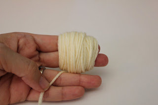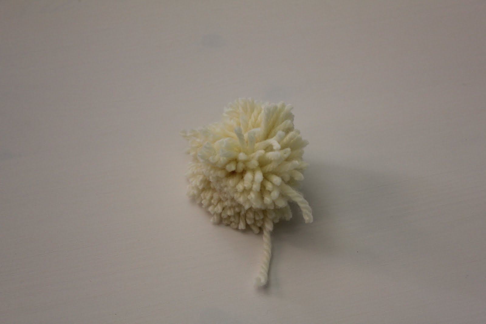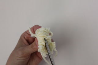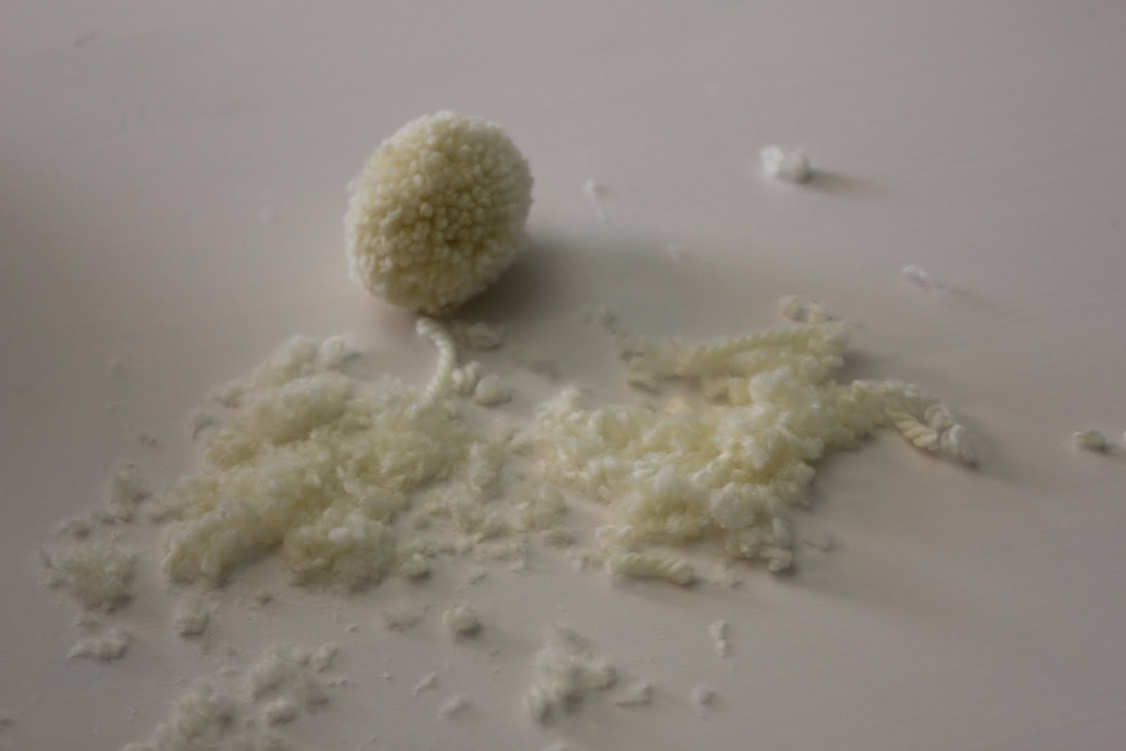 cupping your little pom pom in your hand, start cutting and shaping your pom pom by cutting off yarn little by little in an egg shape leaving more in the middle and less on the top and bottom until it looks like an egg.