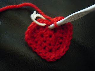 Row 3: hdc in next st, 2 hdc in each of next 2 sts, hdc in next 4 sts, hdc, ch 1, hdc in next st (should be the ch 1 space from previous row making the bottom point of the heart), hdc in next 5 sts, 2 hdc in next 2 sts, hdc in last st, sl st into first st from previous row under (put your needle in the stitch directly under , see pic),