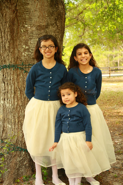 I had planned to make them dresses but the cleaning and organizing left only enough time to make skirts with store bought sweaters. Last year my Dad gifted me a whole roll of this sheer fabric as well as some similarly colored lining. I put it aside not knowing what to make since I don’t like working with that type of fabric. They came out OK, the girls loved them but I can see every flaw where the fabric slipped while I was sewing it. All and all it worked out and hey it was free! (thanks Daddy!).