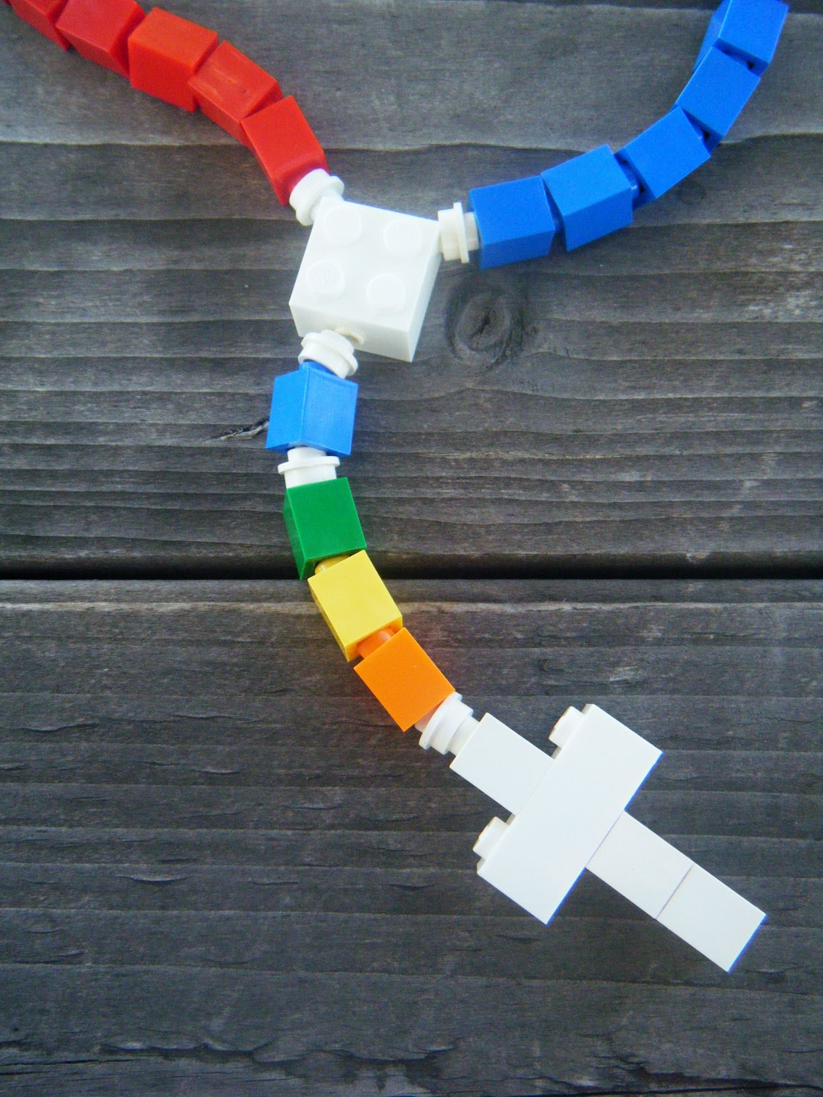 Last week I mentioned a project which I promised to share with you all and here it is. Actually I have been planning on sharing it with you since two Easters ago!!! Man am I a procrastinator. I was reading through my list of things to do and it has been at the bottom of the pile for a long time. Did any of you guess it was a lego rosary? Well, if you did, could you also tell me what the local winning lotto numbers will be? Actually my friend Cristina probably could have guessed because I discussed making them with her last year.