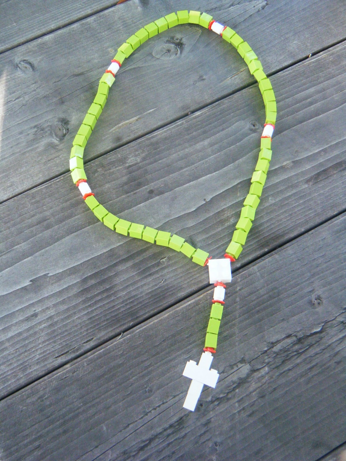 Last week I mentioned a project which I promised to share with you all and here it is.  Actually I have been planning on sharing it with you since two Easters ago!!!  Man am I a procrastinator.  I was reading through my list of things to do and it has been at the bottom of the pile for a long time.  Did any of you guess it was a lego rosary?  Well, if you did, could you also tell me what the local winning lotto numbers will be? Actually my friend Cristina probably could have guessed because I discussed making them with her last year.