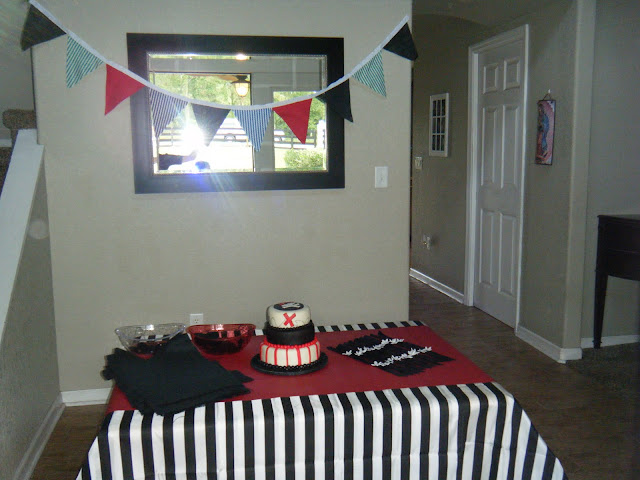 We ended up with a little over 80 guests and half way through the party the heavens opened and the great deluge fell upon us. The rain was so hard (the whole afternoon) that it forced the party inside and every square inch of my house was stuffed with party goers. Among the casualties were my musical islands (my pirate take on musical chairs), a game of walk the plank in the barn and of course what kind of party would I have planned if it did not include a treasure hunt. All told it turned out to be a fun and not soon to be forgotten party.