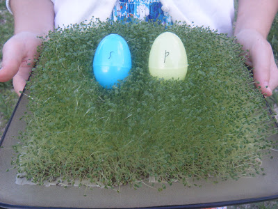 I made these on Easter Sunday night but I wanted to have a grassy bed for them so I had to wait for my chia sprouts to be big enough. At this length they are a bit too bitter to eat as sprouts but they will be cute on our table for a little while.