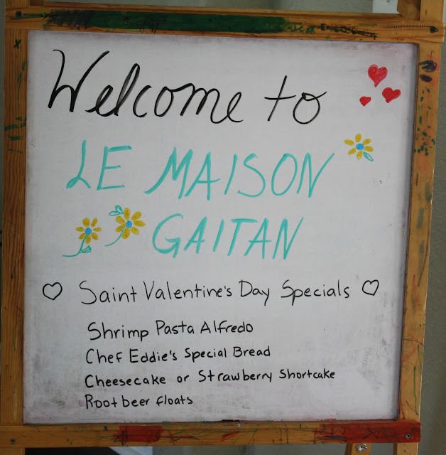 At 5 PM, I asked them to go upstairs and put on nice going out clothing and after to watch a movie (I thought that would be a dead giveaway right there). Poppa jumped into the kitchen and started cooking up a storm while I pulled out the dry erase markers and drew up our “restaurant” sign, folded napkins, set the table, got water pitchers ready and made rootbeer floats.