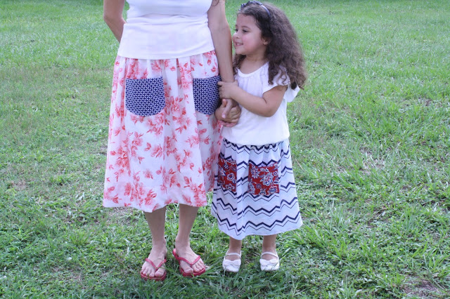 For Livie’s skirt I actually had bought some fabric to make a new 4th of July bunting since our old one has gone missing and never did make it so instead I used one of the fabrics to make her a little skirt just like mine. I may still make that bunting since I usually leave up all red, white and blue decorations throughout July.