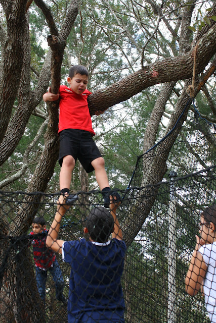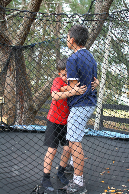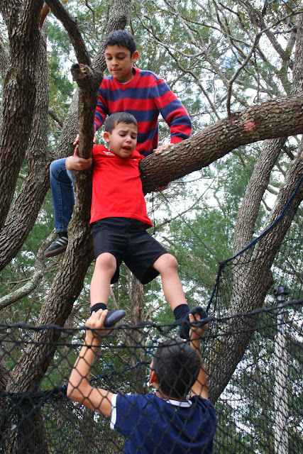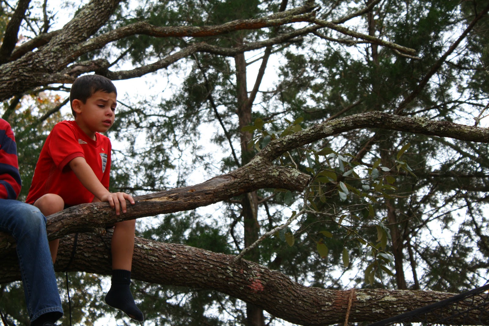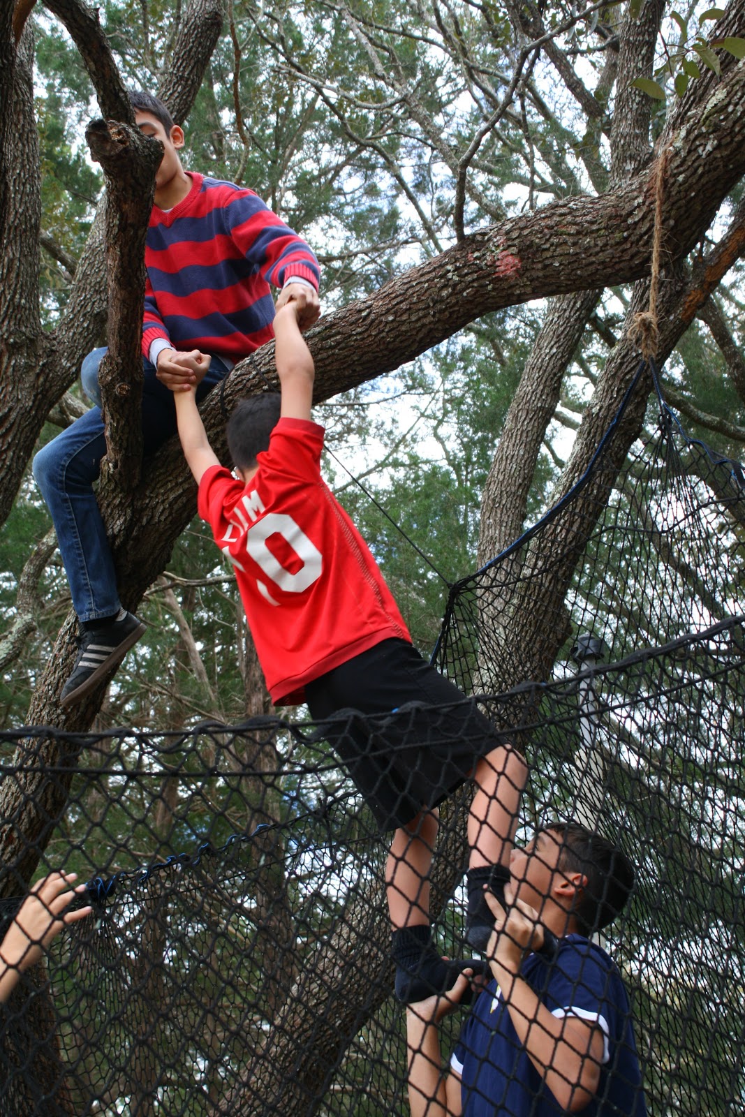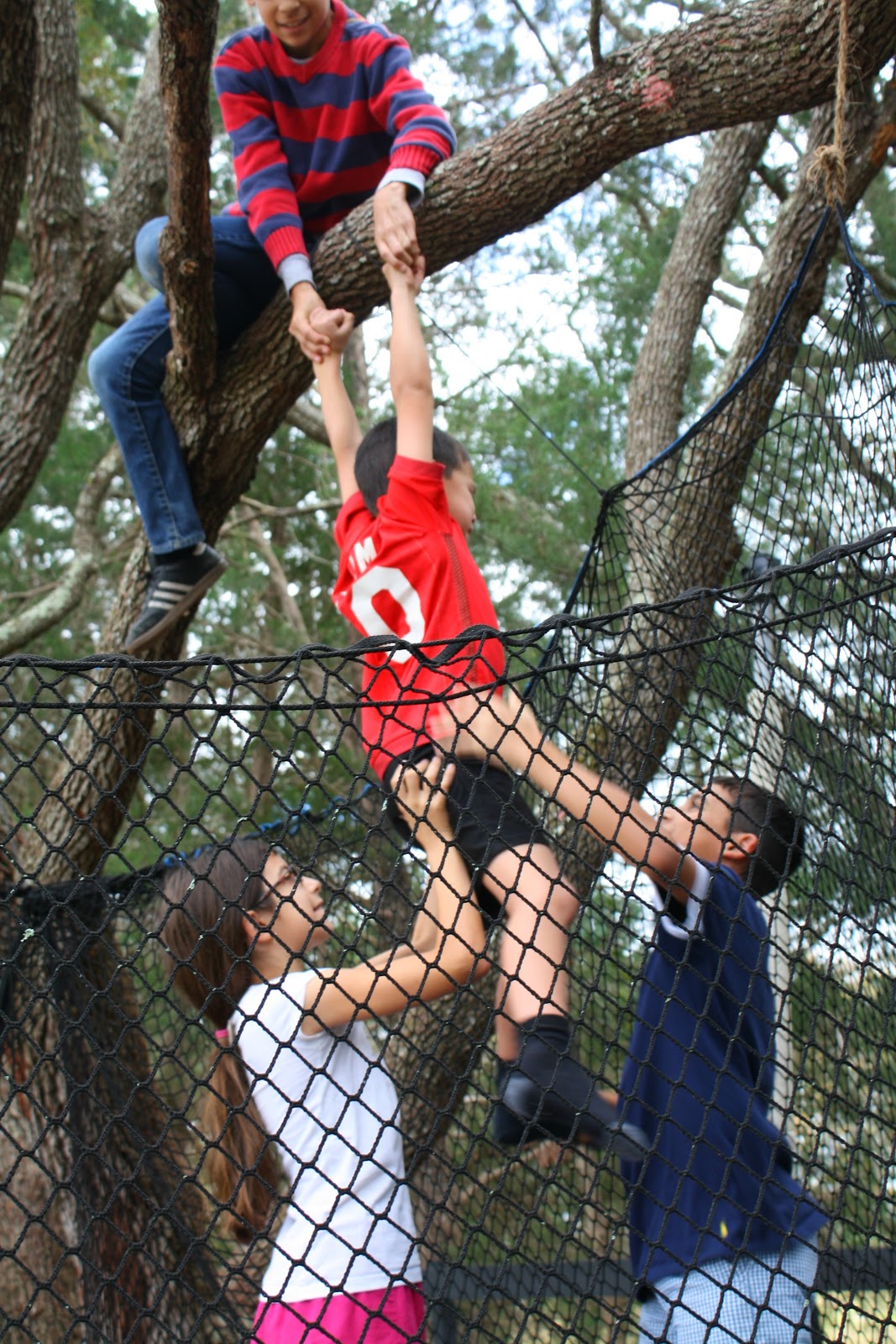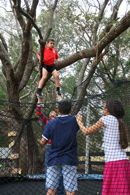 Case in point. I am cleaning the dust bunnies off the ceiling fans downstairs when my little Christopher and Olivia come rushing in excitedly screaming that someone is stuck in a tree. I run out being led by my two little ones to the oak tree that is over our trampoline. Sure enough, JP is stuck in the tree frozen with fear. He is sitting on the very branch that everyone jumps off of into the trampoline.
