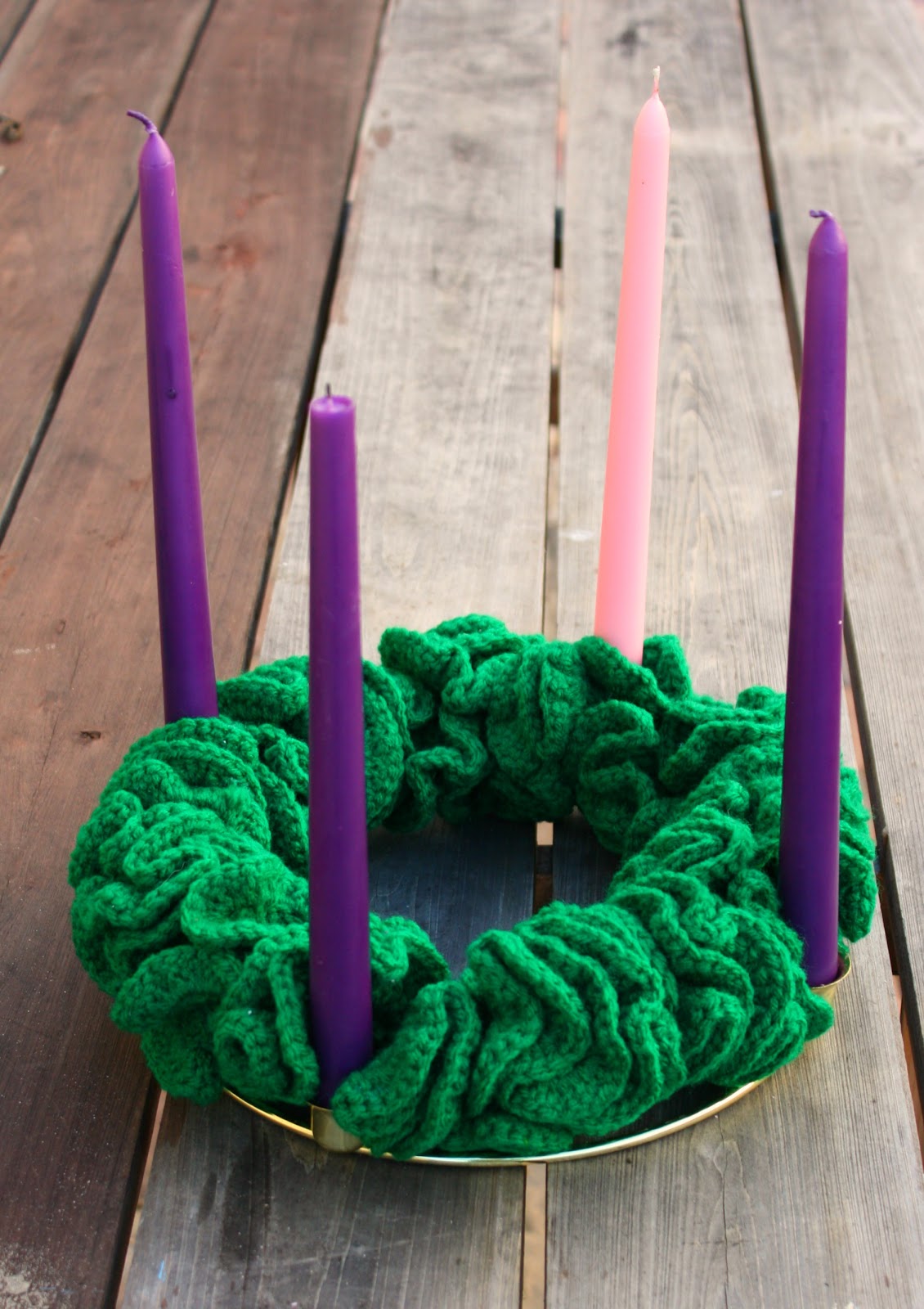 I called this pattern The Times 3 wreath because you make 3 stitches into each st and it will get so full that it will start to fold in on itself creating the deep ruffles. You can add candles to it for Santa Lucia, add a candle holder under it for an Advent Wreath or add berries to it for a Christmas wreath.