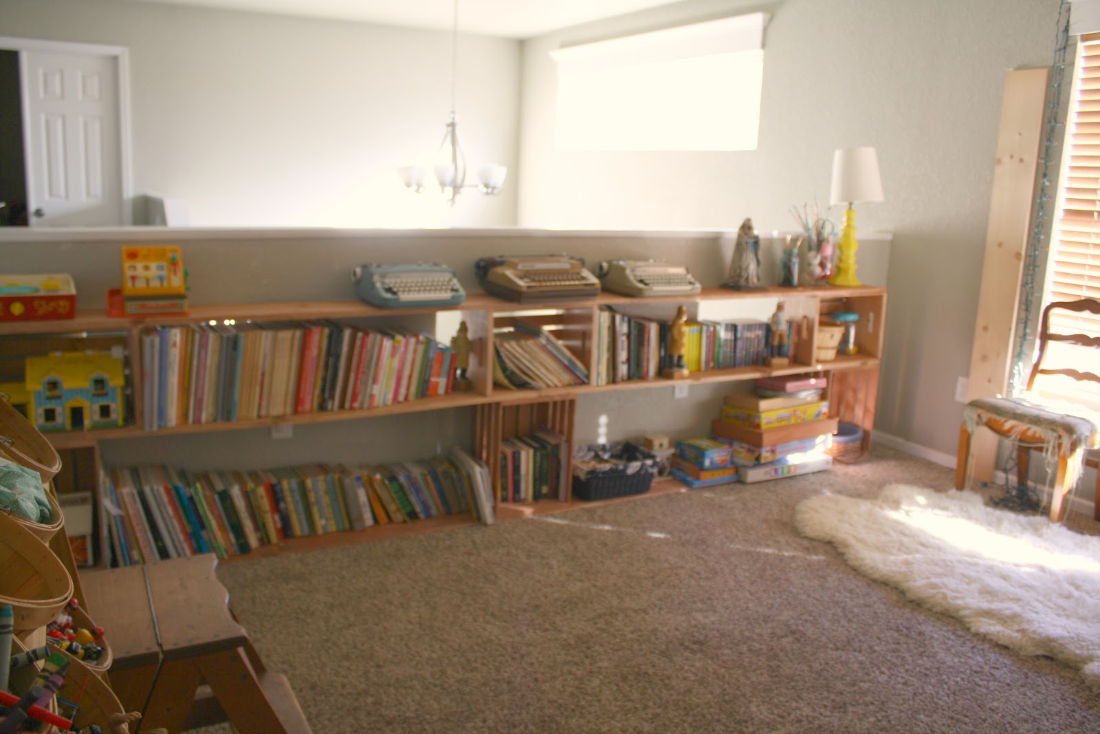 The shelf was super duper easy to make. Just 6 craft crates and 6 six foot long 2×12 wood planks. We stained them and screwed everything together in about 15 minutes.