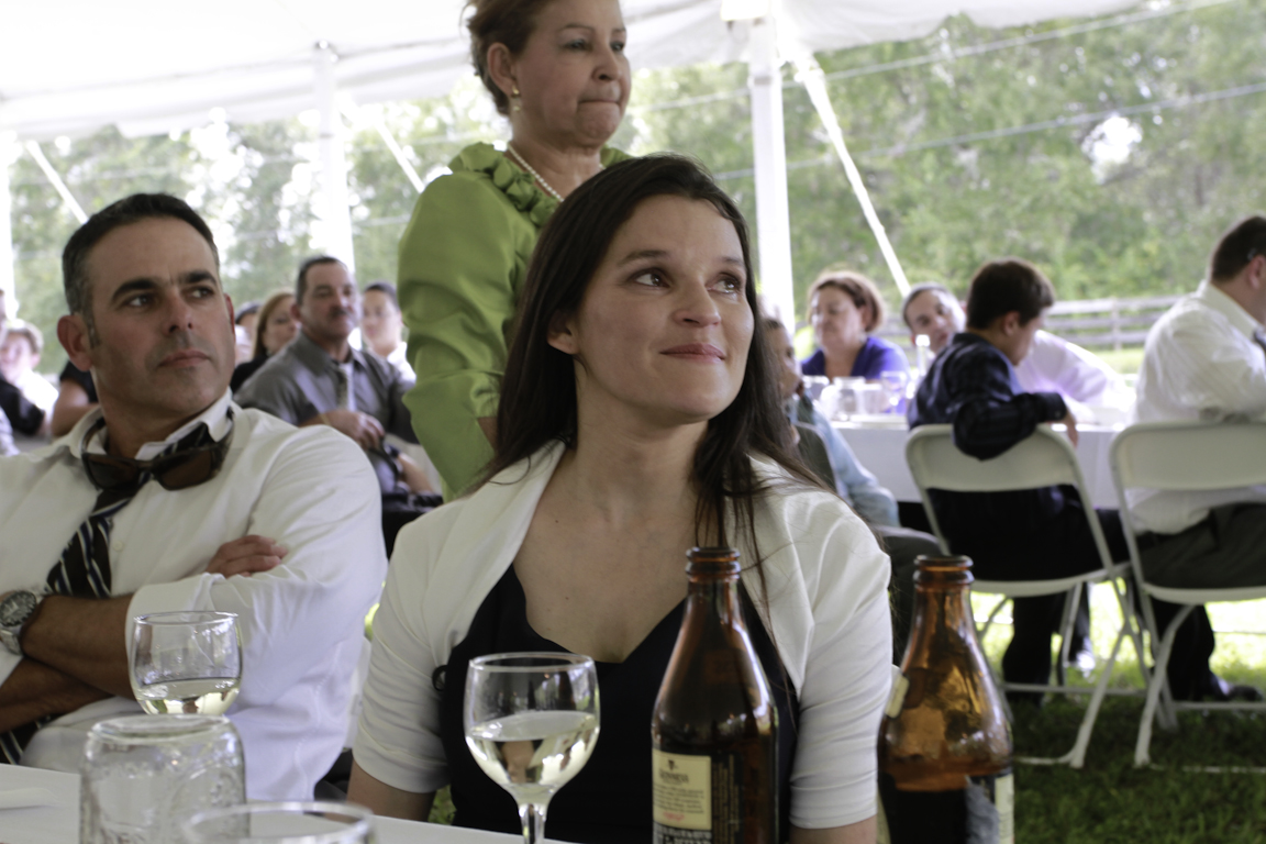JP, in the wedding tent in the early morning folding the napkins for each place setting