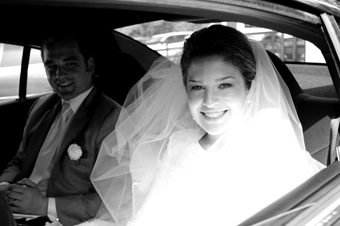 the Bride and Groom arrive and wait in the car until everyone is in the tent