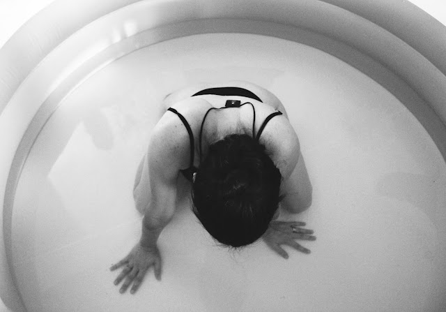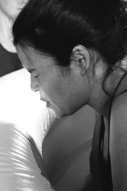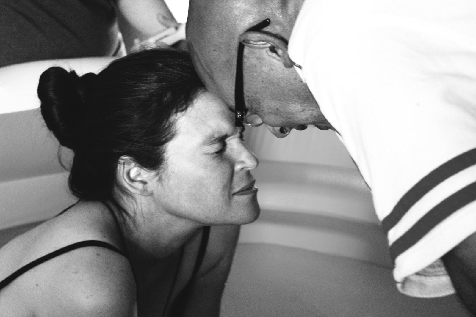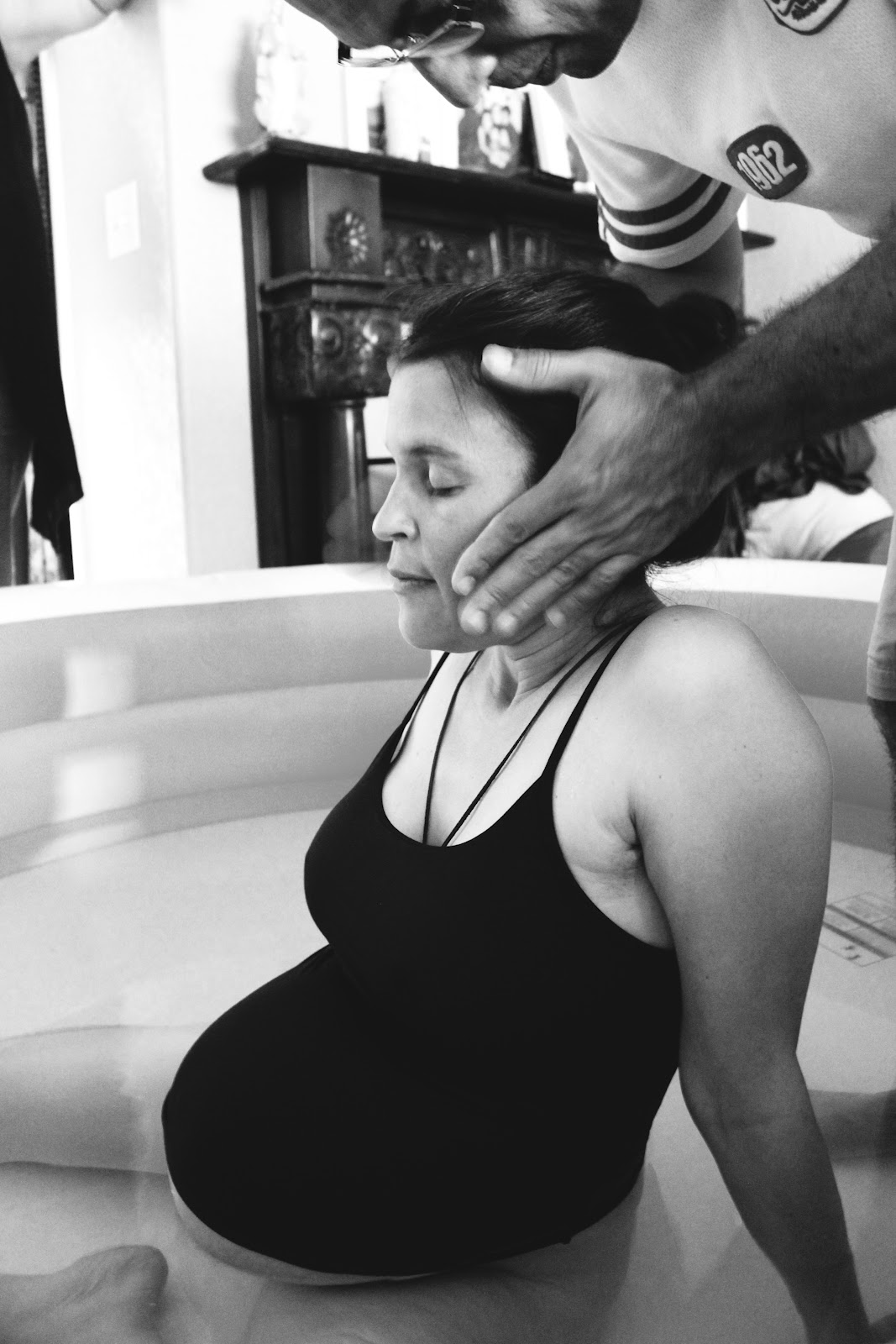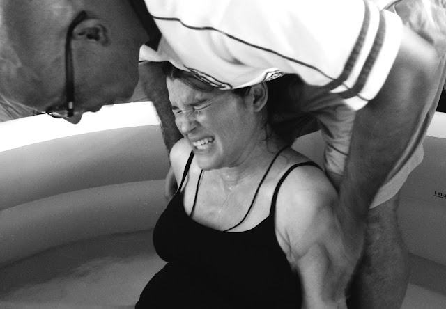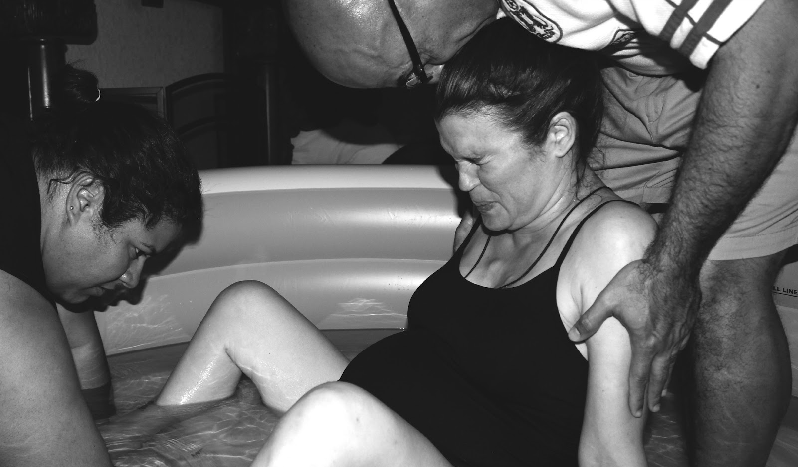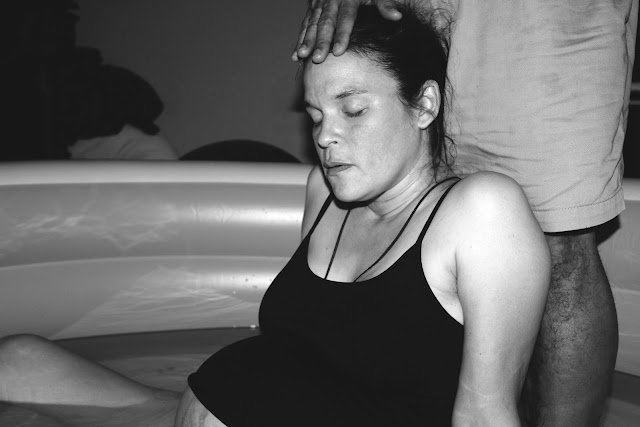 As soon as Alex came in through the door I started to feel more like I was in labor.  We got me in the pool while she got her camera ready.  The waves that were hitting my body were definitely labor now and though I could talk and smile in between them, they were getting very strong.  The warm water felt good on my skin as I rocked back and forth in the pool.  A few more waves and my midwife told me to push whenever I felt the urge.  I sat in the warm water thinking how I did not feel like I was that close to having my baby and all of a sudden it was there, the urge to push.  It was now that the pain hit me like a ton of bricks and I could feel myself losing my wits a bit and wanting to feel sorry for myself.  I know that this is were the heroine is triumphant and strong and takes charge but I wanted to feel sorry for myself and give into this pain.  I am human and I felt small and weak and scared.  Then all of a sudden I felt Poppa’s strong hands on my shoulders and his legs supporting me from behind.  He wiped the sweat from my forehead and told me that I was strong.  I heard the voices of those women who were there to support me telling me that I was doing it, that I was doing great.