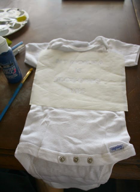 In the very beginning of my pregnancy I took a mental note of a onesie I saw somewhere which I just had to make before I went into labor and knowing that my due date (what is that anyway) is just 11 days I got out the freezer paper and started with the silk screening process. This isn’t true silk screening, actually its more like making a stencil which you then iron on the fabric, paint over it then peel off once the paint is dry to reveal your simple design. Anyhoo…we love making tshirts this way and have used the “silk screening” technique for the last 4 or 5 Christmas to make quick and fun presents.