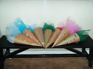 It is called the Schultuete. It is basically a cardboard cone, the translation is literally “school cone” and it is filled with candies, sweets, school supplies, small gifts and any little delights the child would love on this special day.